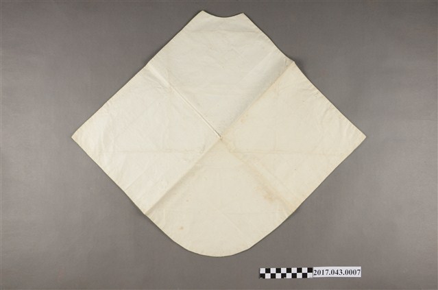 1. 水藍色棉布素面肚兜,正面為水藍色布面,背面為米白色底布,造型近菱形,兩側為銳角,上下兩端呈圓弧狀,是臺灣常見的肚兜樣式。肚兜整體素面無刺繡紋飾圖案,僅肚兜正面四邊與飾片周圍以綠線收邊,頸項處飾片作如意雲頭形,腹部中央布片為花卉形,兩側作扇形,背面則素白無紋。肚兜底布褪色,部分區塊泛黃,曾以對折方式收納,摺痕明顯。2. 清代以後,一般將人們穿著的貼身內衣稱作「肚兜」,在此之前內衣也有心衣、襴裙、抹胸等名稱。臺灣早期成人與孩童都會穿肚兜,其刺繡裝飾方法與中國有明顯的差異。在臺灣,是先將刺繡圖案繡在布片上,再將各式布片接合;而中國的製作方式是直接在肚兜中央繡出紋樣。臺灣最常見的肚兜造型是如本件近似菱形的樣式,不過在一些地域略有不同,如蘭陽地區的肚兜造型下端較寬,底部平整,左右腰腹縮成窄邊;中部地區與北部客家庄則流傳一種加縫護腹片的肚兜。
