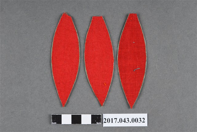 1. 綠絲緞柳葉形繡片組,共1組3件,包括3件大小相近、形狀相同的繡片。繡片形狀如柳葉,圓弧細長形,頂端削尖,底部從中間漸收至短平形,以接縫其他繡片。3件繡片選用的材質及刺繡工藝皆相同,正面底布為湖水綠色絲緞,背面襯合紅色底布。繡片中央使用釘金繡針法刺繡裝飾,作仿植物葉片之葉脈圖案。