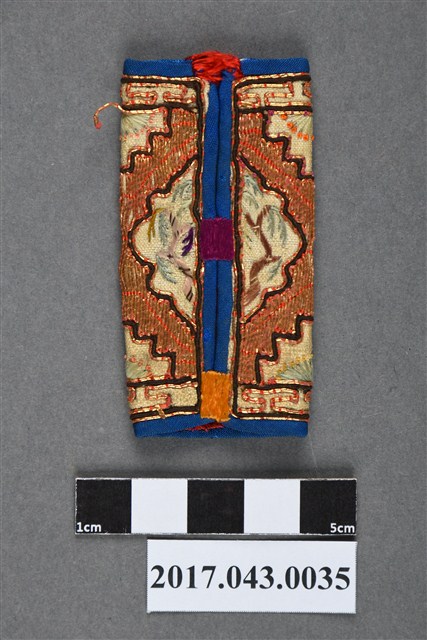 1. 黃底鳥禽紋刺繡手指套,指套上下兩端皆開口,形狀呈圓管狀。整體以一片長方形繡布左右縫合製成,正面表布使用淺黃色布片作底布,周圍以藍色布面包邊。布片滿佈刺繡,主要使用盤金繡及平針、搶針等刺繡技法,繡出指套的上下邊框及框內的回字紋,正中央並同以盤金繡繡出四邊呈三層梯形狀的幾何形框飾。幾何金框內以紫色、淺綠色、鵝黃色、茶色等顏色彩繡枝頭雀鳥圖案。2. 臺灣早期漢人社會中包含閩籍和粵籍兩個族群。這兩個族群的風俗與生活習性略有差異,以服飾裝扮來說,最明顯的差異便是閩籍婦女服飾偏向鮮豔繁複,裝飾物較多,並喜用絲綢質地的布料,而粵籍婦女服飾裝飾素淡,使用的材質也以堅固耐穿為主要考量。本件文物屬於閩籍漢人服裝配件,是飾有華麗刺繡的裝飾物品。
