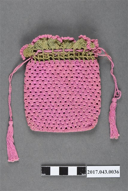 1. 粉色編織荷包,為女子隨身配戴的小囊袋。荷包整體以粉紅色及草綠色織線編結而成,底端作密合編織以利盛物,側面的袋面則作V字、貝殼形狀裝飾,以間隔、鏤空的方式編結。袋面至上方以綠色織線編織兩層鏤空方格樣式後,向上銜接荷葉形開口。荷包呈直式長方形,使用束口方式作開合,於袋口橫串兩條粉紅色織線作束帶,束帶兩端皆連接同樣線材的粉紅色流蘇作裝飾。2. 本件編織錢袋是荷包的一種。傳統漢人服飾一般沒有口袋的設計,因此過去需要攜帶隨身物品時都會在腰間繫掛荷包,以盛裝錢幣等零星雜物。荷包到了清代已不僅止於實用功能,更多的是作為裝飾配件被使用,形式十分多樣,常見的有橢圓形狀的腰圓荷包及呈現心型的雞心荷包,也有方形、葫蘆形狀等。此外,荷包也是民間婚俗中重要的聘禮之一,早期臺灣的女子在親事議定之後,會親手製作荷包作為夫家親屬的見面禮。