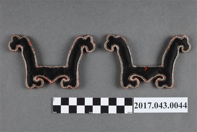 1. 如意雲形繡片組,共1組2件,含有2件形制相同的刺繡布片,是用於縫製衣物服裝或居室佈置等繡品的組件。繡片形狀似方鼎,兩側出枝外擴,至頂端外伸作卷雲形,下半部則向內,作內卷的如意卷雲形狀。繡片布料有兩面,皆使用黑色底布,布面以盤金繡及綠色和米色組成的編織飾帶沿著邊緣縫繡裝飾一周。除邊飾之外,繡片內素面無其他裝飾。2. 據捐贈者所述,本組藏品為陳澄波髮妻張捷(1899-1993)女士的繡品或其收藏品。張捷出身嘉義望族,曾就讀嘉義公學校,當時是陳澄波的同班同學,後張捷未完成公學校學業,轉而在家學習女紅。考量經濟收入來源,中斷學業轉而學習女紅為臺灣早期女子教育頗為常見的現象,而女紅所指的即是刺繡。張捷與陳澄波結婚後,也以其女紅專長扛起家中經濟重擔,全力支持陳澄波赴日留學。
