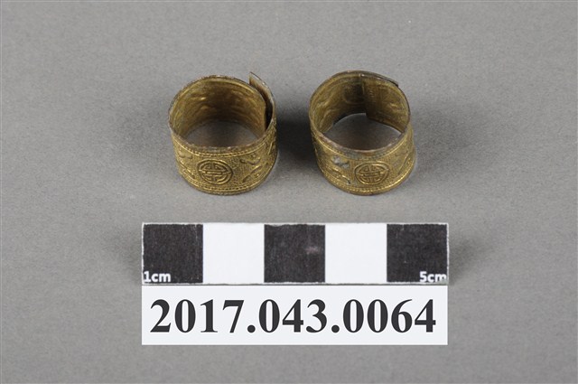 1. 吉祥紋對戒,共1組2件,包含2件形制裝飾皆相同的金屬戒指。戒指通體呈金色,為銅鍍金材質,部分鍍層剝落且生鏽。戒指由長扁形金屬片彎曲捲成,表面使用敲花工藝技術鐫刻紋樣,分別雕飾圓形祿字紋、蝙蝠圖案和壽字紋,意指「福祿壽」;頭尾兩端分飾雙錢紋和盤長結圖案,亦具吉祥意涵。圖紋上下邊緣刻飾稜線,並以粟米金珠為地。戒指為活口金箍,配戴時,可依照戒圍大小調整鬆緊程度。2. 本組對戒的造型與紋飾設計,屬於清代以來流傳的傳統樣式。臺灣早期金銀飾品工藝技術乃承襲自明清時期的傳統,以使用鑿刻與敲花技巧最常見,飾品的種類和款式也多襲自中國。金銀首飾因原材質便屬貴重,因此時常是正式場合中被配戴的物件。臺灣傳統社會中配戴金銀飾品的場合有很多,包括男女婚嫁、孩童彌月週歲、長輩祝壽、慶祝生辰等等,以示對場合或儀式的重視。