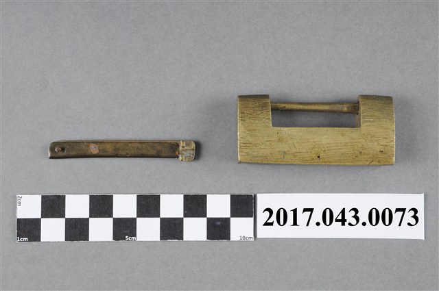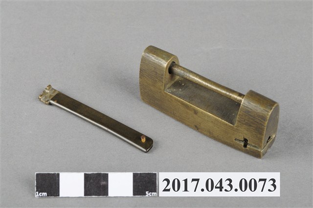 1.銅製廣鎖鑰匙組,包含鎖具本體與鑰匙,是一種中國式的鎖具。鎖體正面呈凹字狀,中間上方為鎖樑,作圓棒狀,兩端端面呈長橢圓形,底部為長方形,下半部一端兩面相鄰的直角處為鑰匙孔,正面形狀為十字形,端面形狀呈不規則三角狀,疑似是破損;鑰匙形狀為細長片狀,頂端為立體狀,上下皆有點狀突起,並附有細扁形狀的保護套。在材質上,鎖匙組為黃銅合金材質,具有金屬光澤,整體佈有橫線狀的鑄造或使用痕跡。本件鎖具構造為簧片式鎖,具有立體鑰匙孔,稱為「定向鎖」或「迷宮鎖」。此類具有立體鑰匙孔的鎖具屬於複合式的開鎖設計,鑰匙插入孔時須以特定位置和方位推動或轉動,才能將鎖開啟。2.中國式鎖具相傳是在戰國時代的魯班(約西元前506年)加以改進後逐漸被廣泛使用,到了東漢末年(約3世紀),已經出現了許多不同造型的鎖具。隨著時間的推移,中國式鎖具的材質也日益豐富,至唐代(618-907)已包括青銅、黃銅、鐵、銀、金等等,在造型外觀也更加多樣化。中國式的鎖具主要分成兩種,一種為以鑰匙開啟的簧片構造鎖,另一種則是不需鑰匙開啟的文字鎖,其中又以前者為大宗,又可分為廣鎖與花旗鎖。簧片鎖的開啟方式主要是利用鑰匙進入鎖體後,擠壓彈簧片而使鎖栓和鎖體分離。相較於現代常見的鎖具,中國式鎖具在設計上更加注重鑰匙孔的設計,如將鑰匙孔隱藏於機關之下,或將鑰匙設計成不易插入鎖體上。