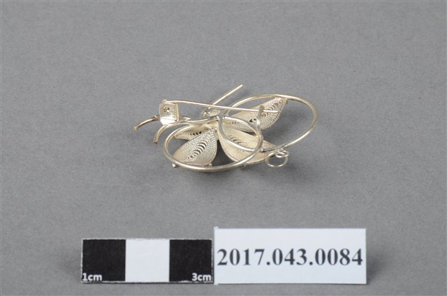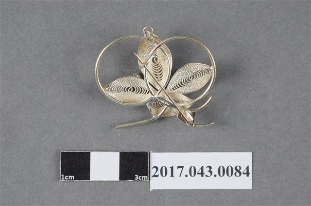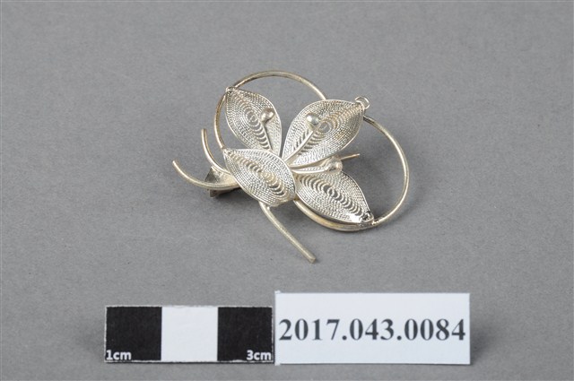 1. 銀纍絲花蝶別針,作蝴蝶與花葉的設計。別針為銀製品,整體富有金屬光澤,主要使用纍絲工技法製作,以銀絲編成股辮,再層層纏繞圈成花瓣狀,共有4枚,其中1瓣反折,讓整體造型更有變化。花瓣上方接有3支花蕊形成花朵,花朵下方接合較粗的銀線,分別作2個大圓圈及幾道弧線,形成蝴蝶翅膀和身體。別針背面接合金屬針,可用於固定在衣物上。別針頂端也附有小圈環,可穿鍊作項鍊墜子。2. 纍絲是中國傳統金屬工藝技法的一種,也稱作「累絲」、「花作」、「花紋」。纍絲的做法是利用金或銀的高延展性,將金銀抽拉成細絲線,再將金銀絲線編織成辮或各式網格面,最後再焊接組裝成形。此外,若要以纍絲技法製作立體作品,則再需經過「堆灰」的程序,將炭末與白芨草液混合物塑成需要的造型,再於其上纍絲,之後置於火中將碳模燒毀才製作完成,屬於特別纖巧的金銀細工。