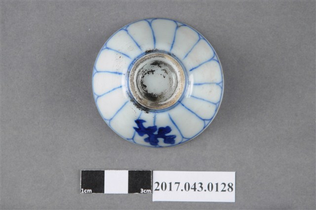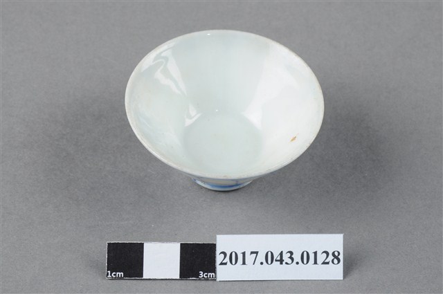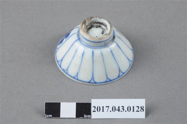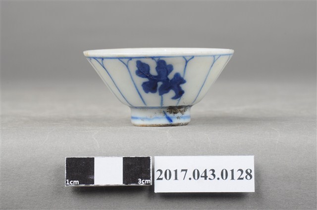 手繪青花花卉紋清酒杯以模具成形,高溫燒製,薄圓唇,敞口,斜壁下收,近圈足處略作方折,弧壁內收至圈足,深腹,杯底較平,小圈足,足徑小於口徑的一半,圈足略高,圈足底刮釉露胎,胎色白中帶灰,胎質略粗,胎體較厚。全器施白釉,釉面光潔細膩,呈色乳白略帶青色調。全器器表有些許氣孔以及雜質沈澱。全器內壁素面無紋飾,紋飾主要繪於外壁。外壁以鈷藍釉於口沿及近圈足處繪圈紋,形成一裝飾帶空間,再繪上長條線條,使外壁有如花瓣開展的效果。外壁一側則濃墨繪一株植物,成為裝飾主體。圈足壁上亦有青花弦紋點綴。
