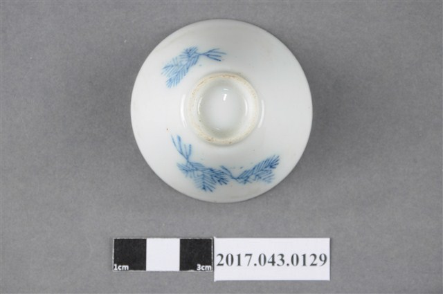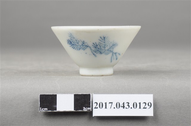 手繪青花松針紋清酒杯以模具成形,高溫燒製,薄圓唇,敞口,斜壁下收,近圈足處略作方折,弧壁內收至圈足,深腹,杯底較平,小圈足,足徑小於口徑的一半,圈足略高,圈足底刮釉露胎,胎色白中帶黃,胎質略粗。全器施白釉,釉面光潔細膩,呈色乳白瑩潤。全器器表僅有少量氣孔,口沿處略有色澤沈澱。全器內壁素面無紋飾,紋飾主要繪於外壁。外壁以鈷藍釉於壁面兩側繪松針紋樣,一為交疊的松針,另一側為單隻松針。以松針紋樣為小杯的裝飾主體,青花發色均勻,呈色略深,筆觸纖細,其餘部分留白。