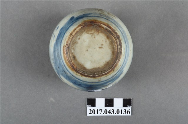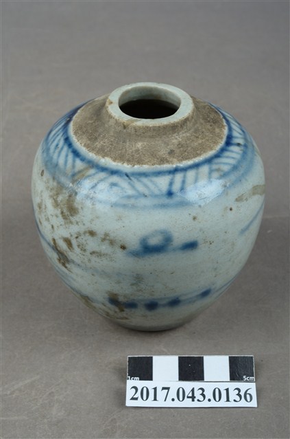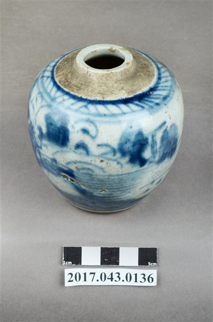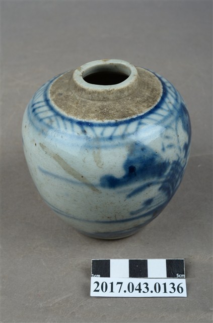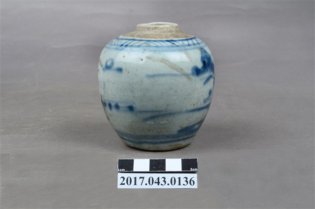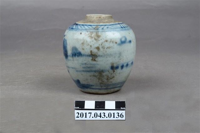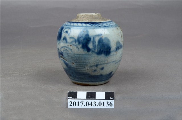 本件青花山水紋小瓷罐直徑約8.2公分,高約8.5公分,原為陳澄波先生收藏品(陳澄波基金會原始編號RE161_01),由其長子陳重光先生捐贈給臺灣歷史博物館。圓口,平唇,短直頸略外闊,圓肩,圓弧腹,全器最大寬度在上腹部,向下內收至底部,整體呈心形。口沿與內緣口、器身外側以及器底施白釉,頸部、肩部上半與圈足露胎,胎土灰褐,器身外側施釉部分以青花鈷料手繪紋樣,上下裝飾細線弦紋與幾何紋,中段裝飾山水紋樣,可能為鴉片膏小瓶。