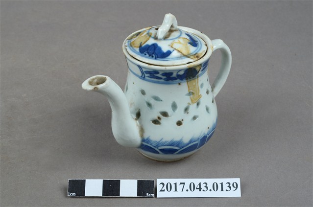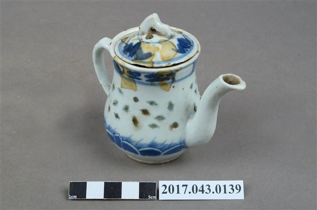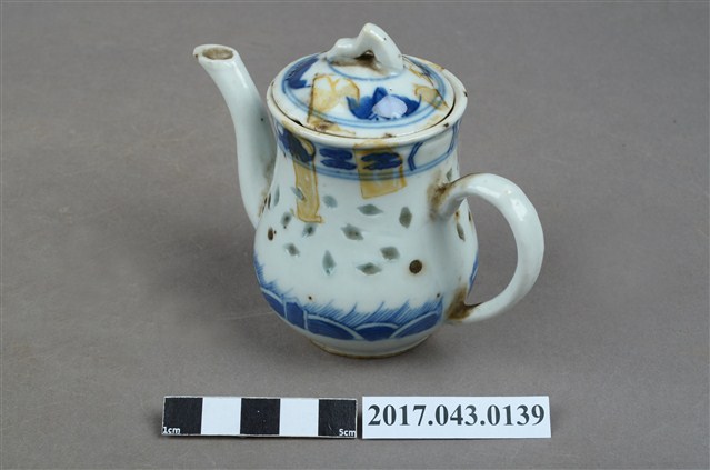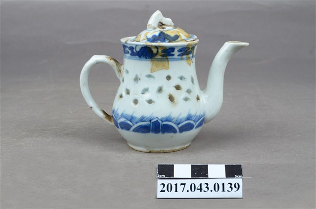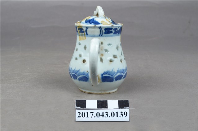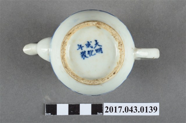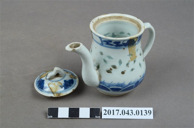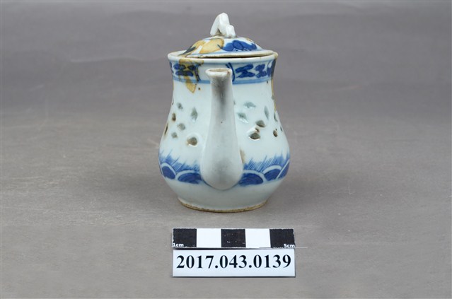 1.本件青花玲瓏瓷茶壺原為陳澄波先生收藏品(陳澄波基金會原始編號RE158_01),由其長子陳重光先生捐贈給臺灣歷史博物館。分成壺身、蓋、流(嘴)、把等部分,壺身上窄下寬,腹部圓弧,底有圈足,流為三彎舌口流,壺把為端把,亦稱圈把,在壺身側方,與口、流呈一直線,壺口上覆有蓋子,蓋鈕為山形。壺身與壺蓋施白釉,壺身腹部中段鑿有米粒形狀裝飾,外口緣、腹部下方與壺蓋面以青花手繪裝飾草葉、幾何線紋,壺底有青花「大明成化年製」字樣。於泡茶時盛裝茶葉與茶水,蓋面上、外口緣、流口內側,以及把手與壺身交接處皆有黃褐色汙漬。2.玲瓏瓷又稱「米通瓷」,是中國景德鎮傳統名瓷之一,此技法最早出現於明代,盛行於明代晚期。作法是先在胚胎上刻出米粒形狀的「玲瓏眼」,先用釉填滿孔眼,再通體施釉,入窯以高溫一次燒成,成品的孔眼透光後略帶透明,玲瓏剔透,通常搭配青花手繪裝飾圖案。本件茶壺壺底有「大明成化年製」字樣,應是日本窯場仿燒米通磁,大明成化年製是當時常見肥前燒款。