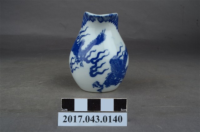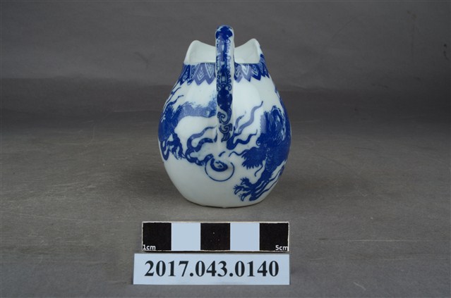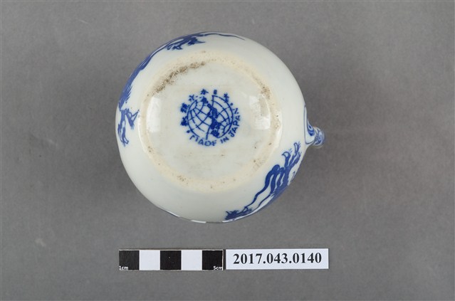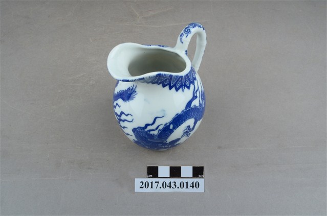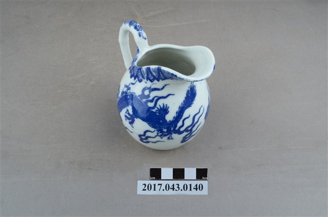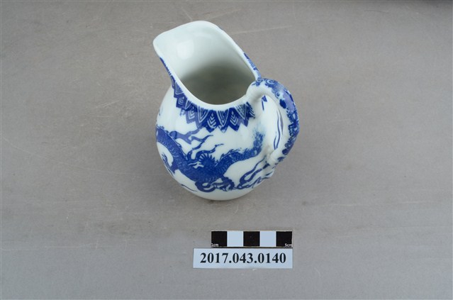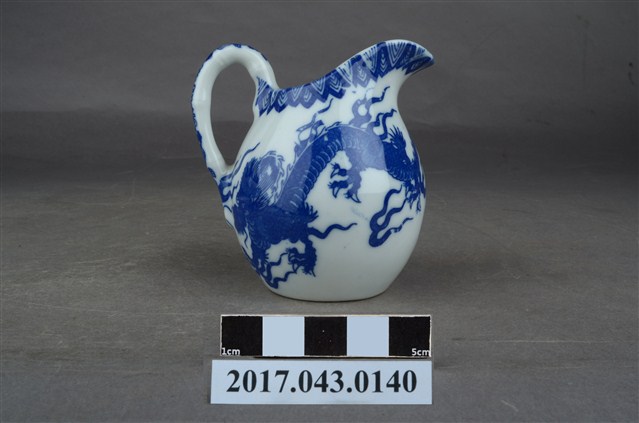 1.本件青花印花龍紋奶罐原為陳澄波先生收藏品(陳澄波基金會原始編號RE154_01),由其長子陳重光先生捐贈給臺灣歷史博物館。廣口帶流,口大致呈橢圓形,流略上揚,流下方作一內凹,器身曲線流暢,器腹渾圓,帶有圈把,平底,底部刮釉一周。以白瓷為底,外器壁以青花印花裝飾,口緣一圈三角幾何紋,器身龍紋環繞,把裝飾花葉紋,底部中央印有日本地圖與地球經緯線圖樣,以及「大日本水鐮□」和「MADE IN JAPAN」字樣。2.本件用途為盛裝牛奶供倒入咖啡或茶中混合飲用,另外也可以作為醬汁罐或油罐來使用,為當時所稱的洋食器,應是外銷瓷器。