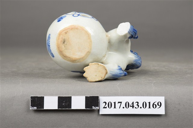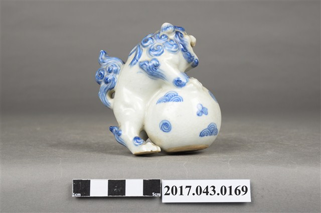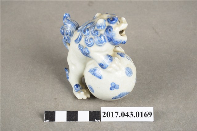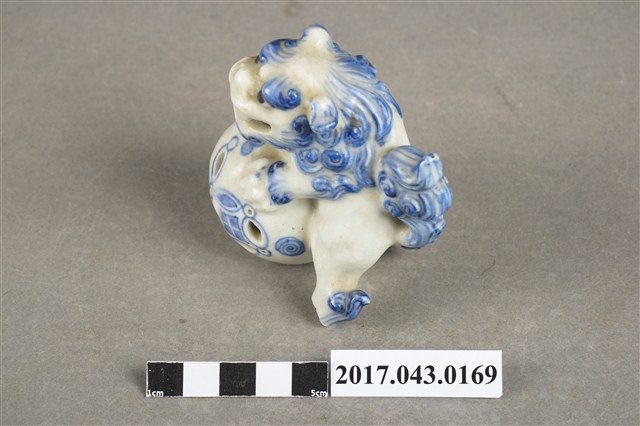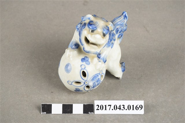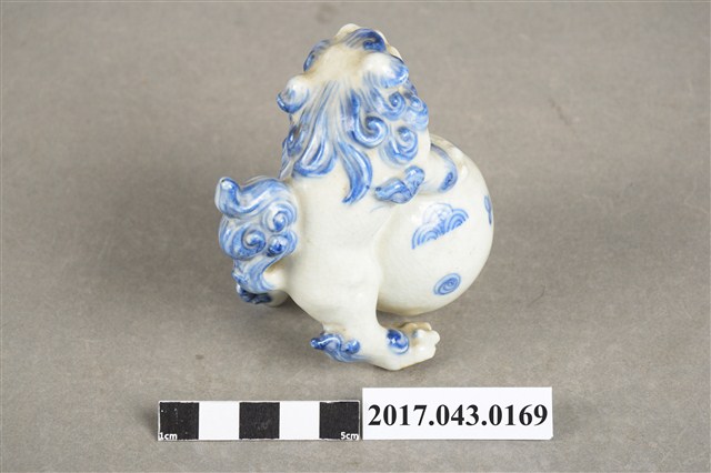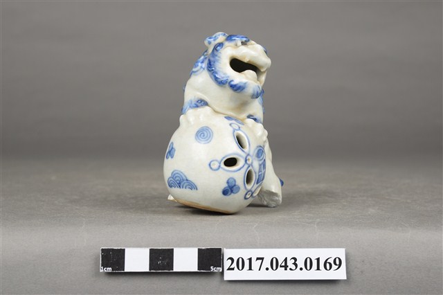 1. 青花鏤空獅戲綵球擺飾,為畫家陳澄波先生的收藏品。獅子身形渾圓,雙耳下垂,毛髮捲曲,歪頭張口,微露齒舌,手抱著大圓球,模樣生動可愛。白瓷胎,胎土細緻白皙,幾無雜質。裝飾技法上,球體上球紋有鏤空雕花裝飾,並以釉下青花繪獅子的毛髮及綵球上的紋飾,綵球上繪球紋、卷渦紋與海濤紋,紋飾所繪線條與填色有濃淡變化,具有日本青花瓷器的特色。獅子腳底及球體底部未上釉,其中一腳底部斷裂遺失,露出潔白胎土。2. 獅子與綵球組合紋樣的出現約可追溯自10世紀前期的中國,爾後此裝飾組合漸漸傳至整個東亞地區,包括朝鮮半島、日本及
