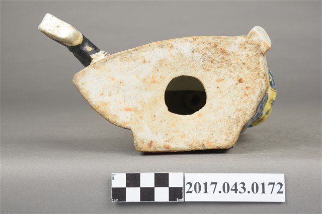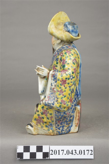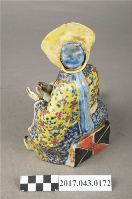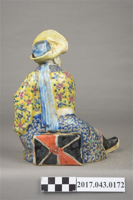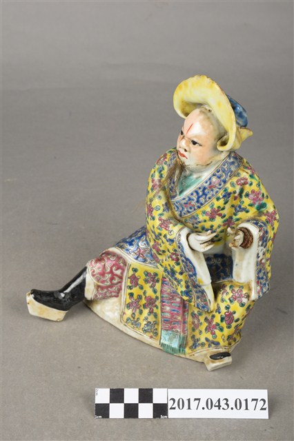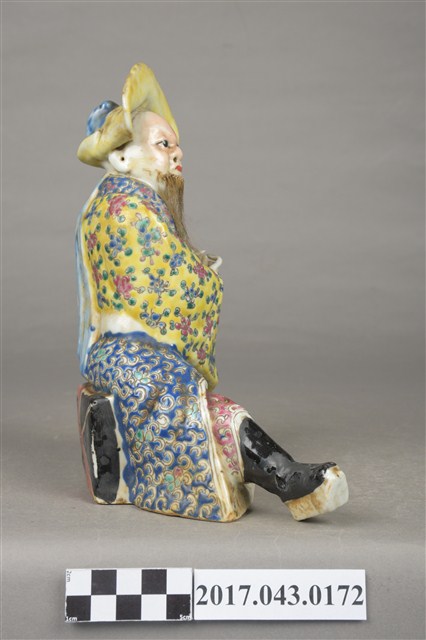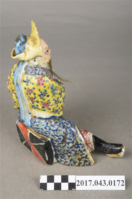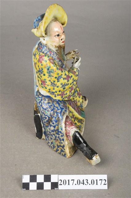 1. 本件為彩繪戲劇人偶擺飾,以模塑方式成形,題材取自傳統戲曲演員之裝扮,面戴長髯,穿著佈滿花卉紋的蟒袍,戴頭巾,腳踏黑色厚底長靴。人偶的姿勢呈現一腳外伸,一腳屈膝的坐姿,兩手似在腰間捧物之貌,兩手掌皆為分開燒製再接上,手指之細小彎曲動作皆呈現而出。面部髯口為毛髮材質,部分已斷裂掉落。全器施釉,以手工繪彩填色,頭巾繪金彩與藍色釉彩,衣飾繪黃、藍、綠、桃紅等色釉彩,使用對比撞色配色,使整體視覺效果鮮豔繽紛。底部未及釉,露胎,中有圓孔,可知人偶內部為中空之狀。2. 本件彩繪戲劇人偶擺飾為畫家陳澄波的收藏品。