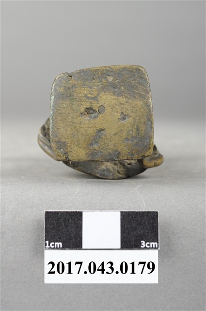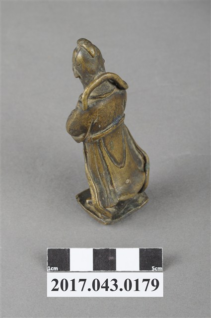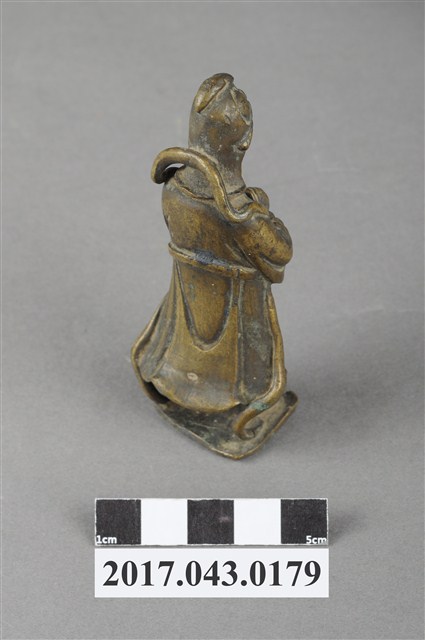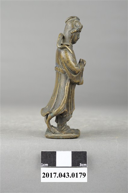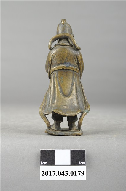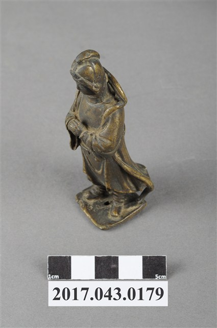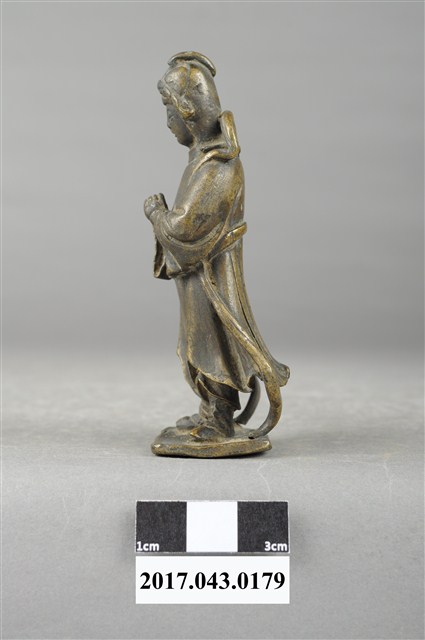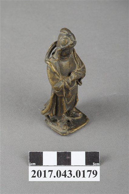 1. 本件為銅鑄武士像,是長寬各約3公分,高度8公分的小像。為銅製材質,造型呈現豎直站立之姿,雙手在胸前交握,杏眼閉合,面頰飽滿圓潤,表情靜謐嚴肅。武士戴風帽,著袍服,下身衣褶呈U字型,下擺略微揚起,穿長靴,披巾帛,披帛沿衣袍翻轉。全像為金屬鑄造而成,未加彩,保持銅鑄原色,部分已生鏽。像附矩形底座,底座上、武士雙腳之間穿有一小圓孔,似應可配置武士的長杖或兵器。2. 本件銅鑄武士像為陳澄波的收藏品。陳澄波(1895-1947)是日治時代具有代表性的畫家,畢業於東京美術學校圖畫師範科。陳澄波的收藏品中,除了