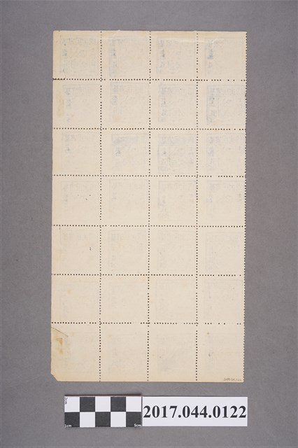 1.本件為臺灣民主國第三版(B)100錢郵票部分全張共28張(完整全張為16*9共144枚)。此張郵票票面為藍黑色;郵票上方印有「臺灣民主國」,其中「主」字左上方斷一劃,是辨認第三版的重要依據;左下寫有「士担帋」,右側則為「錢」,面值「參拾」則為另外印上;中間為老虎的圖像,此版本老虎頭上的「王」字通常較前兩版明顯;從其邊緣的鋸齒狀及連間的打洞可以得知此版本有齒孔。