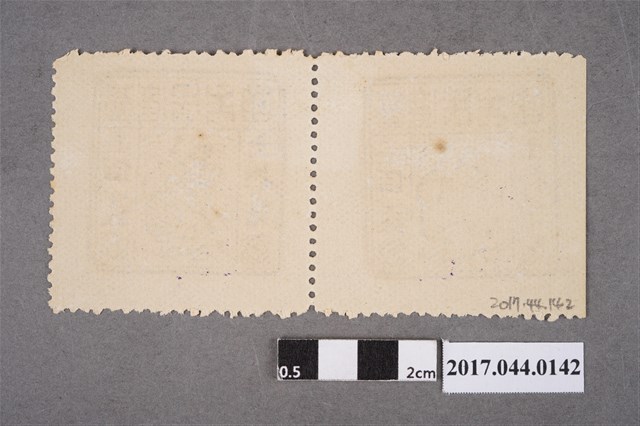 1.本件為臺灣民主國第四版100錢郵票雙連共2枚。此張郵票票面為紫色。第四版郵票大致與第三版相似,郵票上方印有「臺灣民主國」,其中「主」字左上方斷一劃,左下寫有「士担帋」。不同於第三版的是,其郵票面與幣值在顏料上相當一致,似乎為同時印上的;從其邊緣的鋸齒狀可以得知此版本有齒孔。2.第四版郵票根據其顏色、尺寸等細微的差異分為四種版本,該張郵票圖案清晰、顏色均勻,根據筆者推測應為李明亮分類中第四版C版郵票;30錢通常為淡綠色票面,50錢為紅色,100錢為紫色,大部分顏色偏淺,據捐贈者李明亮推測,可能是暫時原料匱乏的緣故。第四版郵票從未真正被使用過,需特別注意的是,其官方發行數量僅18000套,但現在市面上卻很容易買到該版郵票,代表其中很可能混有官模私印票,其郵票真假難辨。3.臺灣民主國郵票又稱「獨虎票」,部分西方文獻指為「黑旗票」。據捐贈者李明亮指出,臺灣民主國郵票是1895年8月任職安平海關的英國人麥嘉林(C. A. McCallum)所創,交由安平海關經營,最初發行的動機是為了替黑旗軍劉永福籌備軍餉,先後發行了五種版次(包括試用版),每版發行一套三枚,面值30錢、50錢、100錢。試用版、第一版至第三版可能的發行時間約為1895年8月中旬至9月初期間,使用至同年10月19日,第四版則未被使用過。郵票印製方式是以手工逐一蓋印,最後再以另一版模印上面值。 (蔡宜璇撰寫)