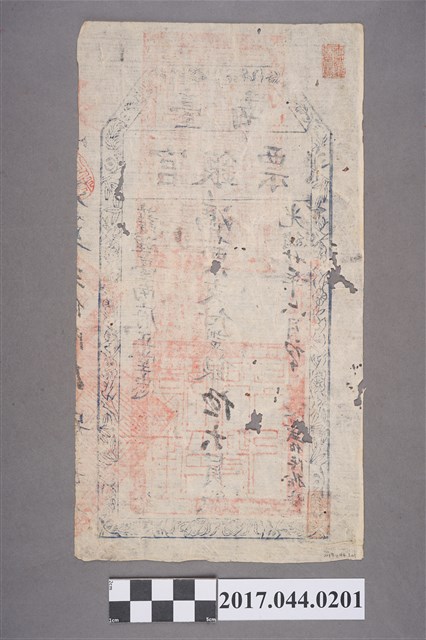 1.本件為臺灣民主國發行的臺南府官銀票一張,有「臺南官銀票護理臺南府正堂忠給,憑票支付七三平銀伍大員照,光緒廿一年六月初十日天字貳佰陸拾號」等文字。此外官銀票上還印有7個大小不一的印章。2. 臺灣民主國抗日中期,因經費不足而設官票局,發行官銀票、官錢票和股份票等。官銀票分「護理臺南府正堂忠」及「官銀錢票總局」兩種,面值分為1圓、5圓及10圓三種面額,且為三聯式,一存府,一存局,一流用,並蓋有臺灣總兵、臺南知府及辦理全臺防務總局之印。(蔡宜璇撰寫,陳怡宏修正)