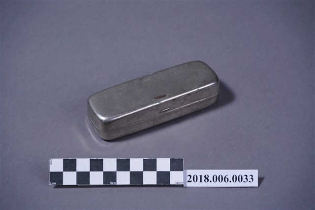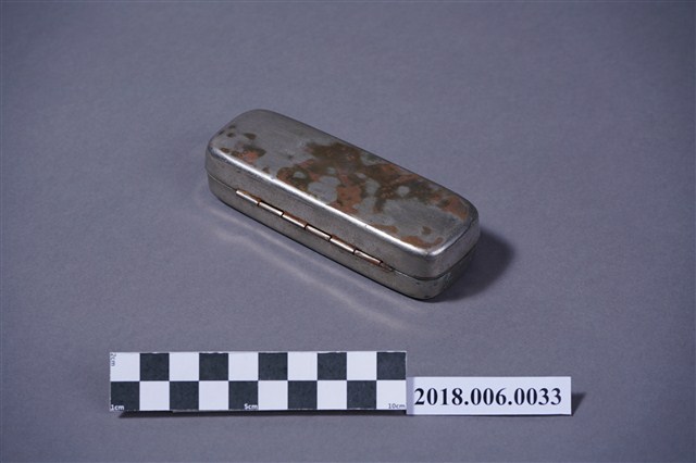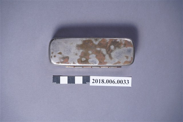 此鐵製盒子的外殼與內部表面,有多處的生鏽痕跡和刮痕。鐵盒功能為放置注射筒,而底部設有四個凸出的鐵片凹槽。