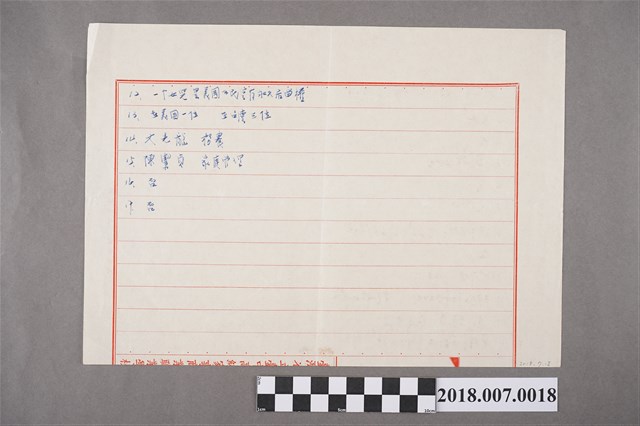 本件為文鍵夫婦因要出國觀光辦理簽證,文鍵預先練習填寫申請文件,以藍色墨水鋼筆寫在臺灣省臺中高級家事商業職業學校的公文紙。捐贈者摺疊收藏,與他件一同放在文鍵銓敘部公文封內。