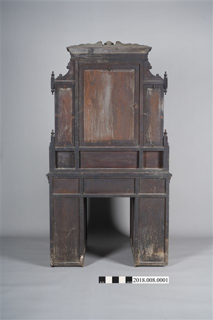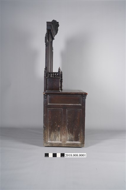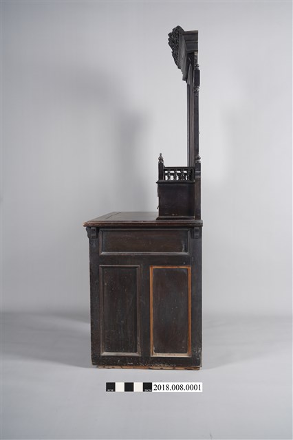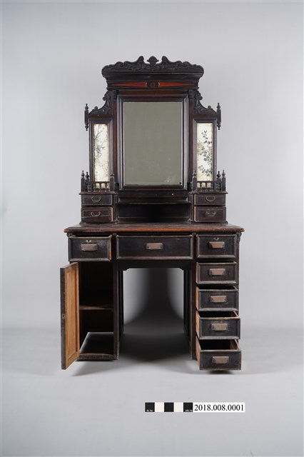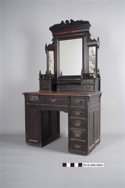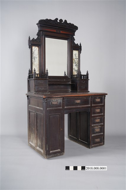 2.本件梳妝臺為日治時期臺灣臺南地區所購買,材質初判為扁柏屬,外型仿西洋式建築,面寬91公分,全高166公分,縱深55公分,通體髹漆,為鏡臺結合書桌形式。梳妝臺以桌面為基準分成上、下兩部分: