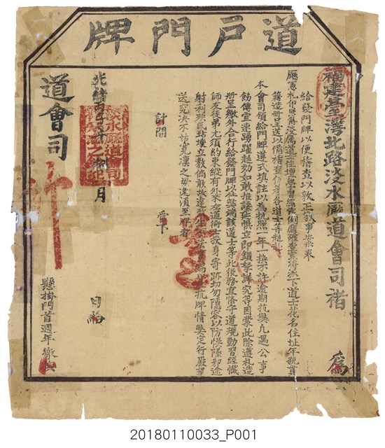福建臺灣北路淡水廳道會司褚發給道戶門牌