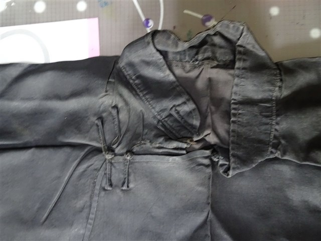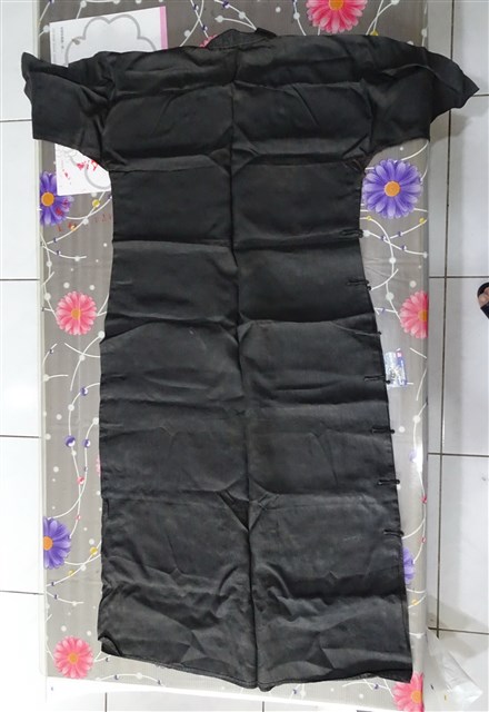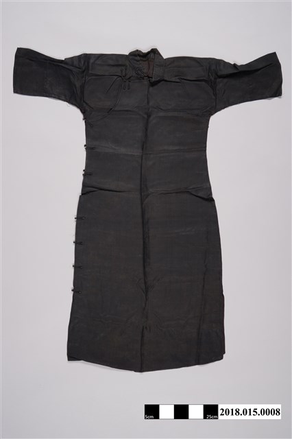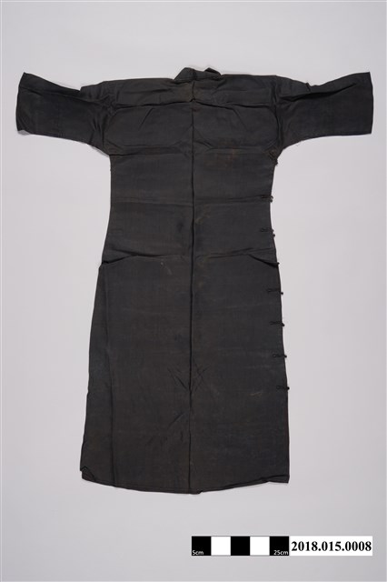 1. 黑色棉質旗袍,立領、七分袖,袖口略呈喇叭狀,軀幹剪裁無明顯腰身,衣長約及小腿,襟開右衽,全件十分樸素無任何裝飾,單層布料無內裡,質地薄但布料偏硬挺,推測為夏季服飾,以機械縫製而成。 2. 本件根據捐贈者提供家族照片推測,為戰後初期王白招女士晚年服裝。