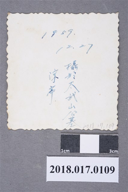 林坤佐於金門當兵時,攝於太武山公墓牌涼亭,照片背面寫有「1959.12.27攝於太武山公墓涼亭」。