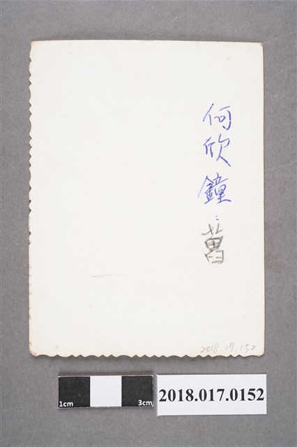 何欣鐘的個人肖像照,由美人攝影。照片右下方有「HOTO STUDIO、美人攝影 」等字樣。何欣鐘為林何賽秋三弟。照片背面寫有「何欣鐘:舊(舅)」字。