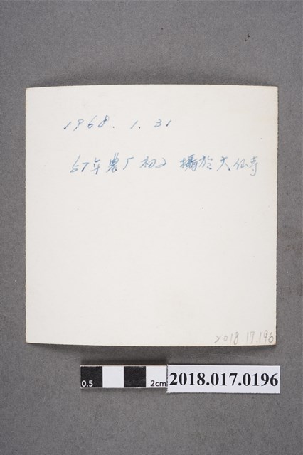 林坤佐,站在臺南關仔嶺大仙寺正殿前的廟埕。背面寫有「1968.1.31、57年農曆初2攝於大仙寺」等字。