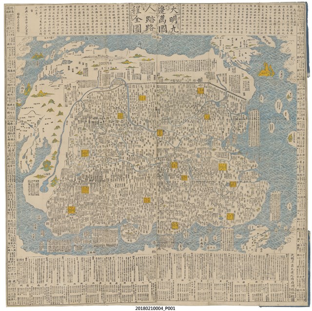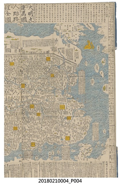 現存版本為王君甫於清康熙二年(1663)印行,地圖右下「大明京省九邊外國府州縣路程圖」兩旁印有「本朝帝畿書坊 梅村彌白重梓」等字樣,推測原圖應繪於明代(1368-1644)年間,於清康熙年間由王君甫重新刊印。