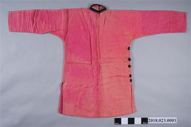 1. 粉紅棉地牡丹緹花大襟女衫,高立領、長袖,袖管細窄,衣身修長,約及臀下,襟開右衽,領口處有1對花形盤扣裝飾,脇邊有5對捲曲型盤扣,立領、領緣及大襟邊緣鑲黑棉布緄邊,右側內襟較短,以粉紅色粗棉布拼縫,無口袋。上衣內裡為粉紅色粗棉布。全件質地較厚,推測為春秋季上衣,整件上衣以手工縫製而成。從合身細長的外型輪廓推測為1910-1920年代之女衫。