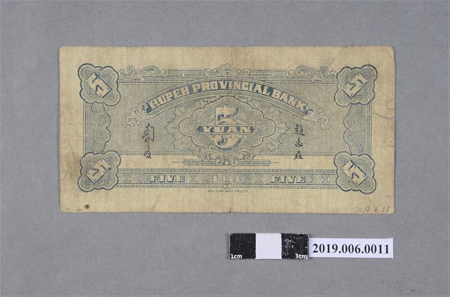 本文物為湖北省銀行發行伍圓紙鈔(民國30年版本)。民國17年11月湖北省政府為整頓金融,設立湖北省銀行,資本額200萬圓,總行設於漢口,委託美國鈔票公司印製紙鈔但未發行。此為民國30年伍圓版本,由大東書局有限公司印製,鈔票版面為藍色,正面印有黃鶴樓圖像及「憑票即付國幣伍圓」,背面印有「HUPEH PROVINCIAL BANK」字樣及董事長名字。