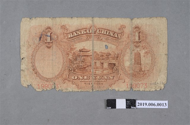 本文物為中國銀行發行壹圓紙鈔(民國13年版本)。中國銀行於民國1年2月5日成立,民國2年總行設於北京。此為民國13年壹圓版本,鈔票版面為紅色,正面印有水牛耕田圖像、「憑票即付國幣壹圓」及兩側「天津」字樣,背面為庭院造景圖像。