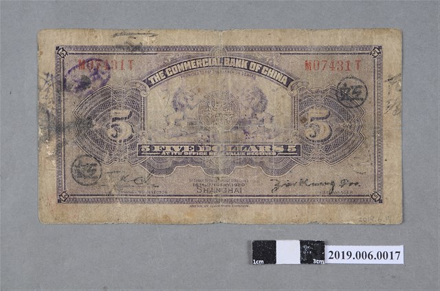 本文物為中國通商銀行發行伍圓紙鈔(民國9年版本)。中國通商銀行為中國第一家銀行,清光緒23年5月27日由督辦鐵路總公司事務大臣盛宣懷奏請設立,光緒22年開始印製紙鈔。此為民國9年1月15日伍圓版本,由美國鈔票公司印製,鈔票版面為紫色,正面印有手持如意、元寶的財神像以及「憑票兌付通用銀圓」、「上海」等字樣,背面則是雙頭獅子成拱形,並印有「THE COMMERCIAL BANK OF CHINA」字樣。
