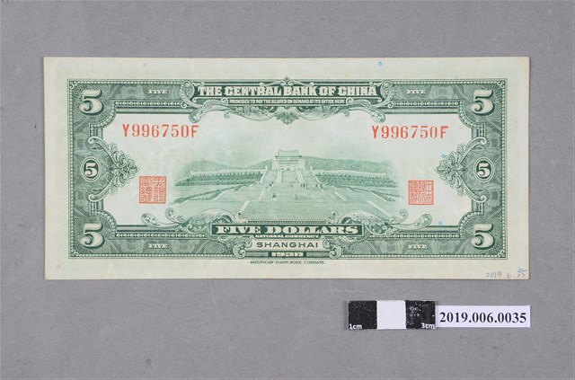 本文物為中央銀行發行伍圓紙鈔(民國19年版本)。民國13年8月16日孫中山於廣州創立中央銀行。此為民國19年伍圓版本,由美國鈔票公司印製,鈔票版面為綠色,正面印有國父孫中山像及「上海」字樣。
