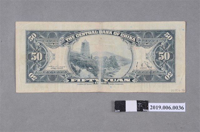 本文物為中央銀行發行伍拾圓紙鈔(民國34年版本)。民國13年8月16日孫中山於廣州創立中央銀行,民國24年改革幣制,放棄銀本位,改行法幣制度,以中央、中國、交通三家銀行發行紙鈔為法幣,民國31年公布「統一發行辦法」,將法幣及中央銀行發行。此為民國34年伍拾圓版本,由美國鈔票公司印製,鈔票版面為灰色,正面印有國父孫中山像。