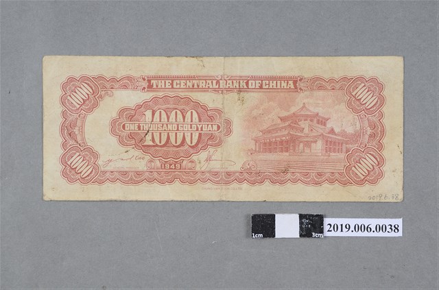 本文物為中央銀行發行金圓券壹仟圓紙鈔(民國38年版)。民國37年法幣及關金券迅速貶值、社會物價高漲,國民政府為安定民心便實行幣制改革政策,廢除法幣改以金圓為主要流通貨幣,依據「金圓券發行辦法」公告法幣參百萬元折合金圓券壹圓,於民國37年8月23日陸續發行各種面值金圓券,最大面額為伍佰萬圓。此為民國38年金圓券壹仟圓版本,由中華書局股份有限公司印製,正面為先總統蔣公像,並印有鈔票編號,背面為廣州中山紀念堂。
