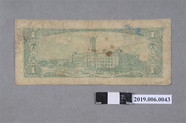 本文物為臺灣銀行發行壹圓紙鈔(民國50年版)。民國38年6月15日臺灣省政府實行幣制改革,公布「新臺幣發行辦法」,發行「新臺幣」(改制前為舊臺幣),舊臺幣肆萬圓兌換新臺幣壹圓,民國38~49年發行之新臺幣版面為直式,民國50年為橫式。民國50年5月1日開始印製新版橫式紙鈔,除保留紙幣圖案保留國父像,更添加臺灣各地風景圖,而原本的「臺灣銀行總行」則改為「中華民國總統府」。此為民國50年壹圓版本,由臺灣銀行印刷所印製,紙鈔版面顏色正面為灰色,反面為綠色,正面為孫中山國父像及蘇花公路風景圖像,背面圖案為中華民國總統府。