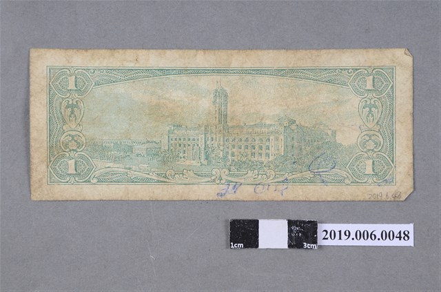 本文物為臺灣銀行發行壹圓紙鈔(民國50年版)。民國38年6月15日臺灣省政府實行幣制改革,公布「新臺幣發行辦法」,發行「新臺幣」(改制前為舊臺幣),舊臺幣肆萬圓兌換新臺幣壹圓,民國38~49年發行之新臺幣版面為直式,民國50年為橫式。民國50年5月1日開始印製新版橫式紙鈔,除保留紙幣圖案保留國父像,更添加臺灣各地風景圖,而原本的「臺灣銀行總行」則改為「中華民國總統府」。此為民國50年壹圓版本,由臺灣銀行印刷所印製,紙鈔版面顏色正面為灰色,反面為綠色,正面為孫中山國父像及蘇花公路風景圖像,背面圖案為中華民國總統府。