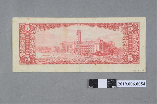 本文物為臺灣銀行發行伍圓紙鈔(民國50年紅色版)。民國38年6月15日臺灣省政府實行幣制改革,公布「新臺幣發行辦法」,發行「新臺幣」(改制前為舊臺幣),舊臺幣肆萬圓兌換新臺幣壹圓,民國38~49年發行之新臺幣版面為直式,民國50年為橫式。民國50年5月1日開始印製新版橫式紙鈔,除保留紙幣圖案保留國父像,更添加臺灣各地風景圖,而原本的「臺灣銀行總行」則改為「中華民國總統府」。此為民國50年伍圓版本,由中央印製廠印製,紙鈔版面顏色共有紅色及棕色兩款,此款為紅色,正面為孫中山國父像及鵝鑾鼻燈塔風景圖像,背面圖案為中華民國總統府。