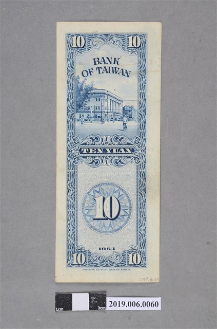 本文物為臺灣銀行發行拾圓紙鈔(民國43年版)。民國38年6月15日臺灣省政府實行幣制改革,公布「新臺幣發行辦法」,發行「新臺幣」(改制前為舊臺幣),舊臺幣肆萬圓兌換新臺幣壹圓,民國38~49年發行之新臺幣版面為直式,民國50年為橫式。此為民國43年拾圓版本,由臺灣銀行印刷所印製,紙鈔版面顏色為藍色,正面為孫中山國父像,背面圖案為臺灣銀行總行並印有「BANK OF TAIWAN」、「TEN YUAN」英文字樣。