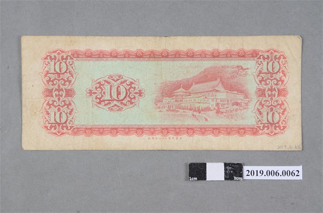 本文物為臺灣銀行發行拾圓紙鈔(民國58年版)。民國38年6月15日臺灣省政府實行幣制改革,公布「新臺幣發行辦法」,發行「新臺幣」(改制前為舊臺幣),舊臺幣肆萬圓兌換新臺幣壹圓,民國38~49年發行之新臺幣版面為直式,民國50年為橫式,民國50年5月1日開始印製新版橫式紙鈔。此為民國58年拾圓版本,由中央印製廠印製,紙鈔版面顏色為紅色,正面為孫中山國父像,背面圖案為陽明山中山樓。
