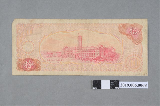 本文物為臺灣銀行發行拾圓紙鈔(民國65年版)。民國38年6月15日臺灣省政府實行幣制改革,公布「新臺幣發行辦法」,發行「新臺幣」(改制前為舊臺幣),舊臺幣肆萬圓兌換新臺幣壹圓,民國38~49年發行之新臺幣版面為直式,民國50年為橫式,民國50年5月1日開始印製新版橫式紙鈔。此為民國65年拾圓版本,由中央印製廠印製,紙鈔版面顏色為紅色,正面為孫中山國父像,背面圖案為中華民國總統府。