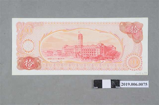 本文物為臺灣銀行發行拾圓紙鈔(民國65年版)。民國38年6月15日臺灣省政府實行幣制改革,公布「新臺幣發行辦法」,發行「新臺幣」(改制前為舊臺幣),舊臺幣肆萬圓兌換新臺幣壹圓,民國38~49年發行之新臺幣版面為直式,民國50年為橫式,民國50年5月1日開始印製新版橫式紙鈔。此為民國65年拾圓版本,由中央印製廠印製,紙鈔版面顏色為紅色,正面為孫中山國父像,背面圖案為中華民國總統府。