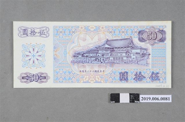 本文物為臺灣銀行發行伍拾圓紙鈔(民國61年版)。民國38年6月15日臺灣省政府實行幣制改革,公布「新臺幣發行辦法」,發行「新臺幣」(改制前為舊臺幣),舊臺幣肆萬圓兌換新臺幣壹圓,民國38~49年發行之新臺幣版面為直式,民國50年為橫式,民國50年5月1日開始印製新版橫式紙鈔。此為民國61年伍拾圓版本,由中央印製廠印製,紙鈔版面顏色為紫色,正面為孫中山國父像,背面圖案為陽明山中山樓。