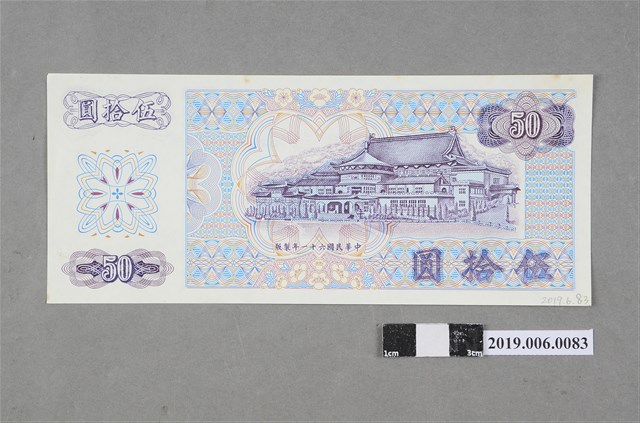 本文物為臺灣銀行發行伍拾圓紙鈔(民國61年版)。民國38年6月15日臺灣省政府實行幣制改革,公布「新臺幣發行辦法」,發行「新臺幣」(改制前為舊臺幣),舊臺幣肆萬圓兌換新臺幣壹圓,民國38~49年發行之新臺幣版面為直式,民國50年為橫式,民國50年5月1日開始印製新版橫式紙鈔。此為民國61年伍拾圓版本,由中央印製廠印製,紙鈔版面顏色為紫色,正面為孫中山國父像,背面圖案為陽明山中山樓。