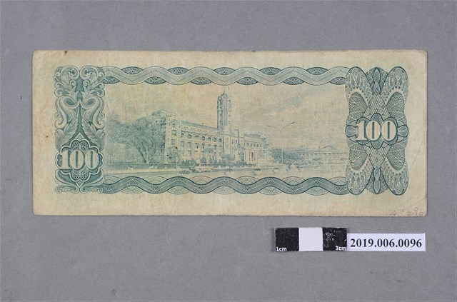 本文物為臺灣銀行發行壹佰圓紙鈔(民國59年版)。民國38年6月15日臺灣省政府實行幣制改革,公布「新臺幣發行辦法」,發行「新臺幣」(改制前為舊臺幣),舊臺幣肆萬圓兌換新臺幣壹圓,民國38~49年發行之新臺幣版面為直式,民國50年為橫式,民國50年5月1日開始印製新版橫式紙鈔。此為民國59年壹佰圓版本,由中央印製廠印製,紙鈔版面顏色為綠色,正面為孫中山國父像,背面圖案為中華民國總統府。