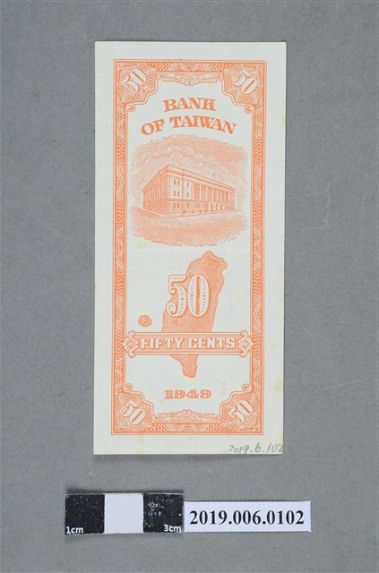 本文物為臺灣銀行發行伍角紙鈔(民國38年版)。民國38年6月15日臺灣省政府實行幣制改革,公布「新臺幣發行辦法」,發行「新臺幣」(改制前為舊臺幣),舊臺幣肆萬圓兌換新臺幣壹圓,民國38~49年發行之新臺幣版面為直式,民國50年為橫式。此為民國38年伍角版本,由中央印製廠臺北廠印製,紙鈔版面顏色為橘色,正面為孫中山國父像,並印有「每拾角兌壹圓」及鈔票編號,背面圖案為臺灣銀行總行並印有「BANK OF TAIWAN」、「FIFTY CENTS」英文字樣。