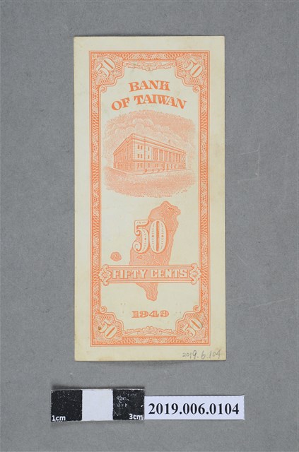 本文物為臺灣銀行發行伍角紙鈔(民國38年版)。民國38年6月15日臺灣省政府實行幣制改革,公布「新臺幣發行辦法」,發行「新臺幣」(改制前為舊臺幣),舊臺幣肆萬圓兌換新臺幣壹圓,民國38~49年發行之新臺幣版面為直式,民國50年為橫式。此為民國38年伍角版本,由中央印製廠臺北廠印製,紙鈔版面顏色為橘色,正面為孫中山國父像,並印有「每拾角兌壹圓」及鈔票編號,背面圖案為臺灣銀行總行並印有「BANK OF TAIWAN」、「FIFTY CENTS」英文字樣。