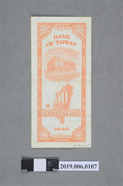 本文物為臺灣銀行發行伍角紙鈔(民國38年版)。民國38年6月15日臺灣省政府實行幣制改革,公布「新臺幣發行辦法」,發行「新臺幣」(改制前為舊臺幣),舊臺幣肆萬圓兌換新臺幣壹圓,民國38~49年發行之新臺幣版面為直式,民國50年為橫式。此為民國38年伍角版本,由中央印製廠臺北廠印製,紙鈔版面顏色為橘色,正面為孫中山國父像,並印有「每拾角兌壹圓」及鈔票編號,背面圖案為臺灣銀行總行並印有「BANK OF TAIWAN」、「FIFTY CENTS」英文字樣。