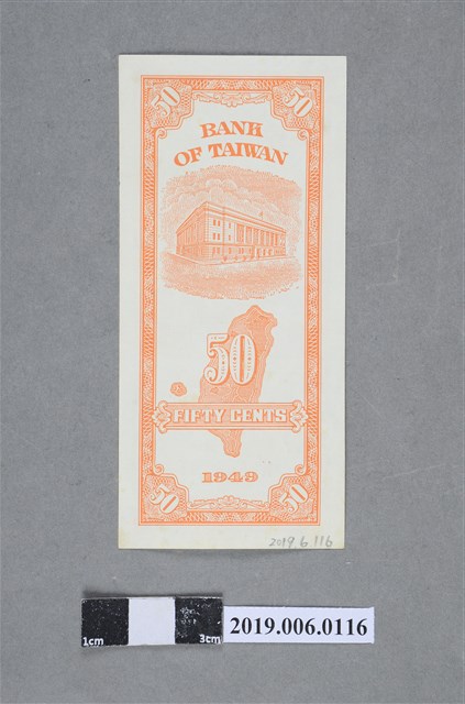 本文物為臺灣銀行發行伍角紙鈔(民國38年版)。民國38年6月15日臺灣省政府實行幣制改革,公布「新臺幣發行辦法」,發行「新臺幣」(改制前為舊臺幣),舊臺幣肆萬圓兌換新臺幣壹圓,民國38~49年發行之新臺幣版面為直式,民國50年為橫式。此為民國38年伍角版本,由中央印製廠臺北廠印製,紙鈔版面顏色為橘色,正面為孫中山國父像,並印有「每拾角兌壹圓」及鈔票編號,背面圖案為臺灣銀行總行並印有「BANK OF TAIWAN」、「FIFTY CENTS」英文字樣。