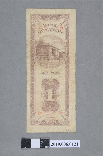 本文物為臺灣銀行發行壹圓紙鈔(民國43年馬祖地區版)。民國38年6月15日臺灣省政府實行幣制改革,公布「新臺幣發行辦法」,發行「新臺幣」(改制前為舊臺幣),舊臺幣肆萬圓兌換新臺幣壹圓,民國38~49年發行之新臺幣版面為直式,民國50年為橫式。而原本新臺幣僅在臺灣本島地區流通,為因應金門、大陳及馬祖等地區經濟需要,馬祖地區於民國48年11月1日公告發行「限馬祖通用」新臺幣,規定僅限在該地區使用,不得攜帶至本島。此為民國43年馬祖地區壹圓版本,印刷廠分別有「臺灣銀行印刷所」及「中央印製廠」兩個版本,本版為臺灣銀行印刷所印製,紙鈔版面顏色為咖啡色,正面為孫中山國父像,加印「限馬祖地區通用」字樣,背面圖案為臺灣銀行總行,上下印有「馬祖」、「BANK OF TAIWAN」、「ONE YUAN」字樣。